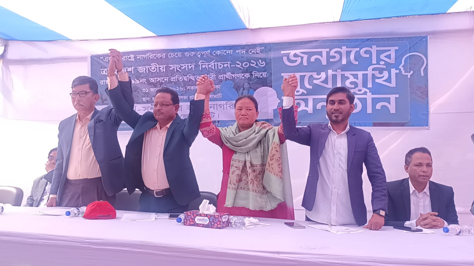 সুজন জেলা সভাপতি অ্যাডভোকেট দীননাথ তঞ্চঙ্গ্যার সভাপতিত্বে অনুষ্ঠিত সভায় রাঙামাটি-২৯৯ আসনের প্রতিদ্বন্দ্বী ৭ জন প্রার্থীর মধ্যে ৪ জন অংশগ্রহণ করেন। উপস্থিত প্রার্থীরা হলেন বিএনপি মনোনীত দীপেন দেওয়ান, বাংলাদেশ বিপ্লবী ওয়ার্কার্স পার্টি মনোনীত জুঁই চাকমা, জাতীয় পার্টি মনোনীত অশোক তালুকদার এবং গণ অধিকার পরিষদ মনোনীত এম এ আবুল বাশার।