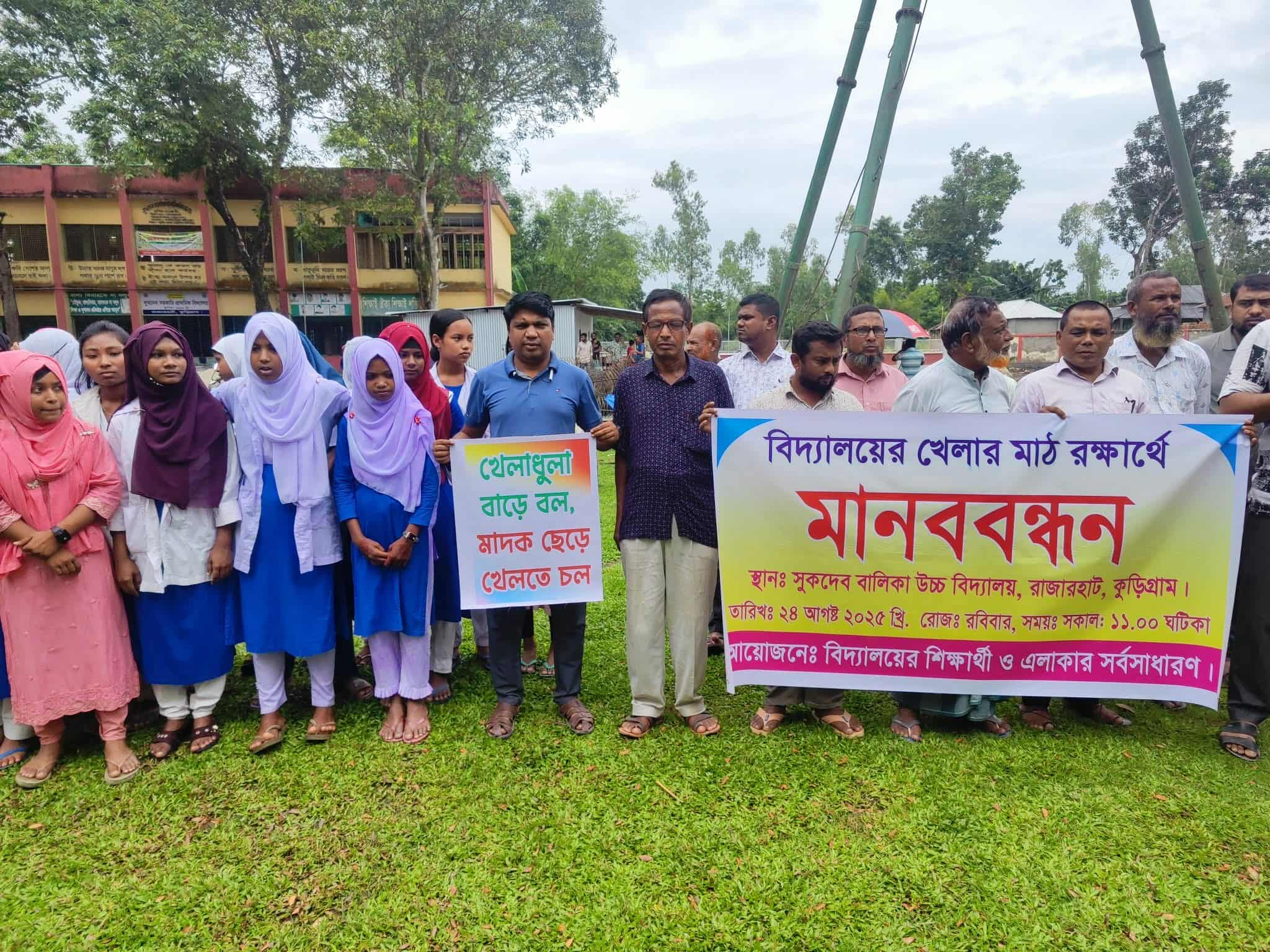 কুড়িগ্রামের রাজারহাটে সুকদেব বালিকা উচ্চ বিদ্যালয়ের মাঠ রক্ষার দাবিতে শিক্ষার্থী ও এলাকাবাসীর মানববন্ধন অনুষ্ঠিত করেছে। মাঠের জায়গায় মাঠ চাই, জমি কিনে ভবন চাই’ শ্লোগানে সুকদেবে খেলার মাঠ রক্ষার দাবিতে মানববন্ধন করেছে শিক্ষার্থীসহ এলাকাবাসী।