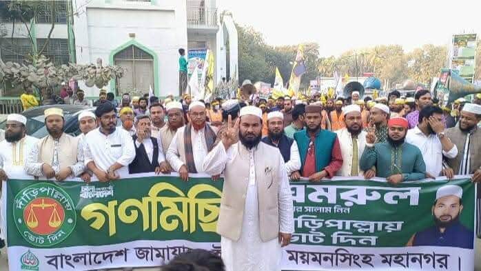 সমৃদ্ধ ও মানবিক ময়মনসিংহ সদর গড়ার প্রত্যয়ে ১১ দলীয় জোট মনোনীত বাংলাদেশ জামায়াতে ইসলামীর ময়মনসিংহ-৪ (সদর) আসনের দাঁড়িপাল্লা প্রতীকের প্রার্থী মাওলানা কামরুল আহসান এমরুলের নেতৃত্বে এক বিশাল গণমিছিল অনুষ্ঠিত হয়েছে।